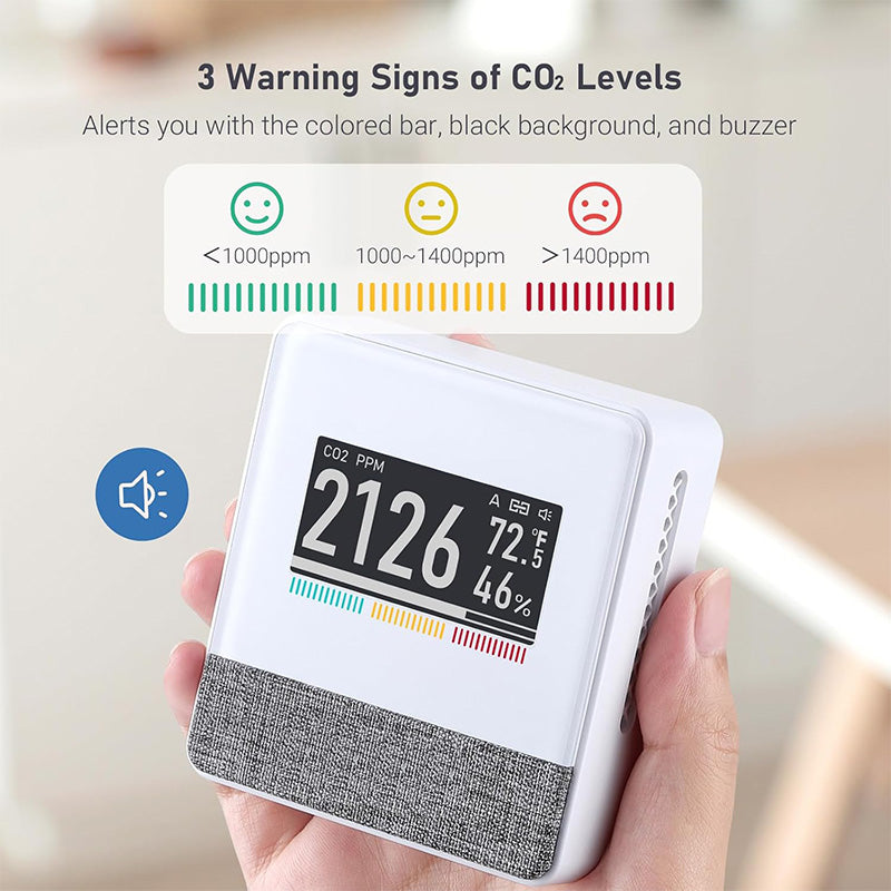 - Measures Carbon Dioxide: (CO2) levels to help prevent poor ventilation and reduce health risks. (<1000ppm (GOOD), 1000-1400ppm (MEDIUM), >1400ppm (BAD).